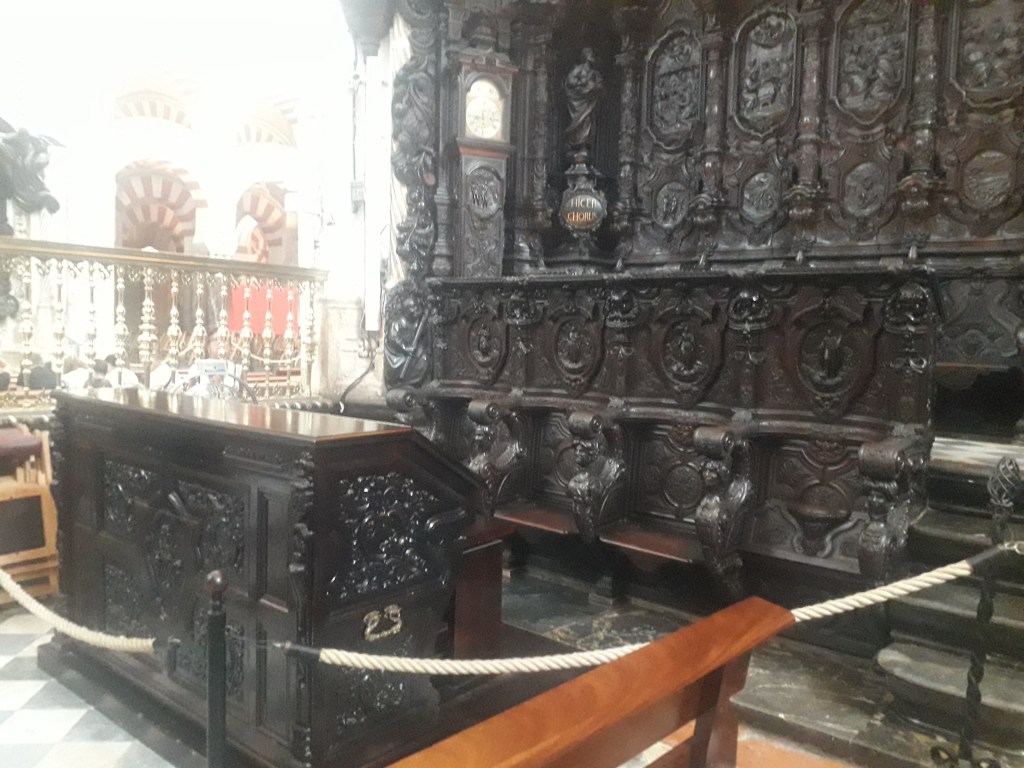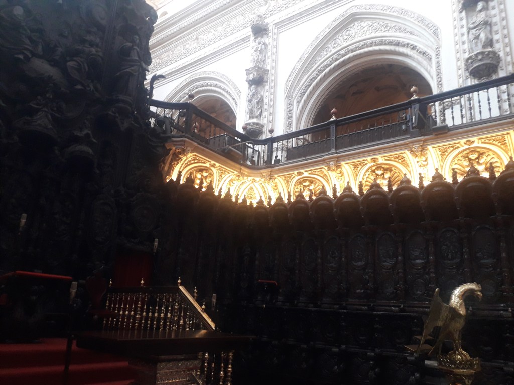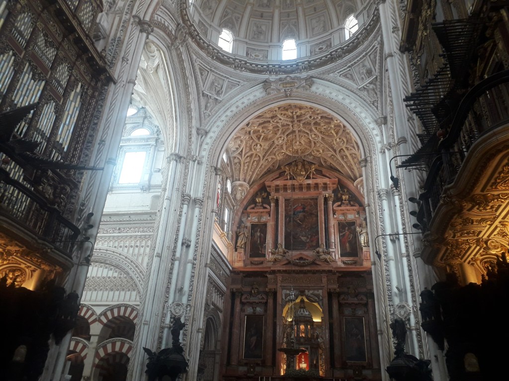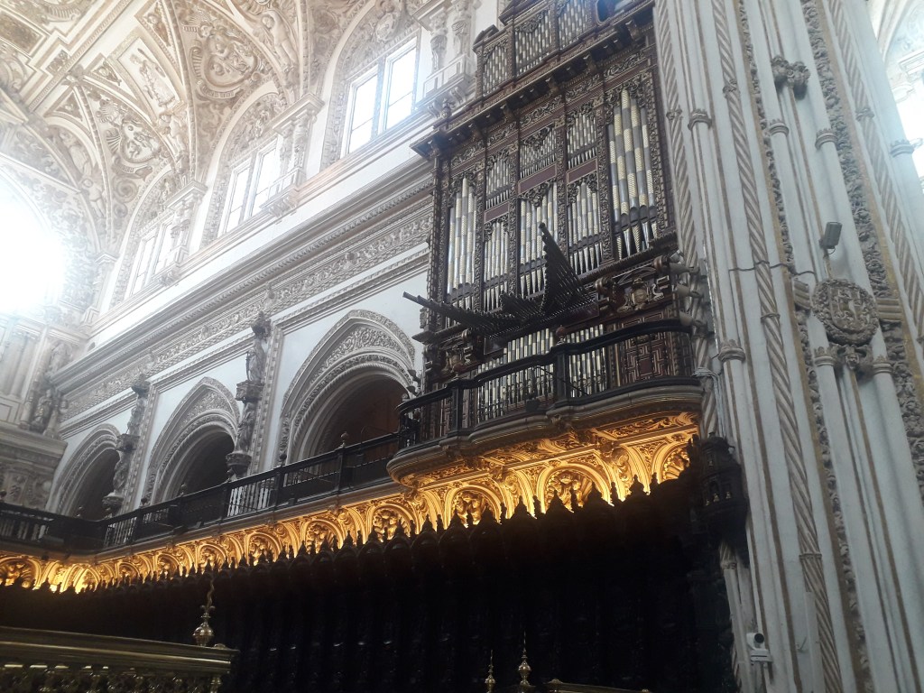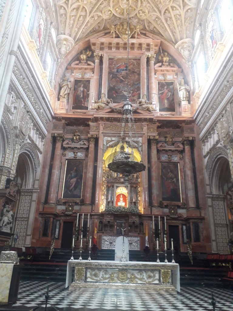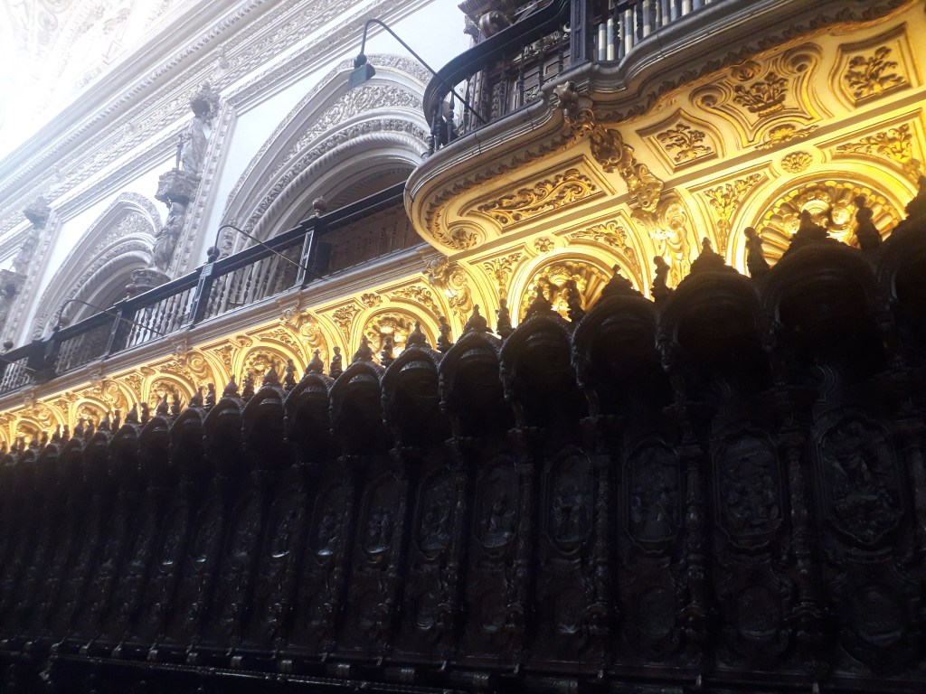 Comme vous l’avez remarqué, la religion chrétienne s’est approprié ce qui fut la troisième mosquée du monde par sa taille. 🕌 En effet, Cordoue était une ville califale. Elle était également l’agglomération la plus importante d’Europe à cette époque, forte d’un demi-million d’habitants. Voici quelques photos du chœur baroque de la cathédrale, où j’ai pu assister à un sacrifice humain en début de journée, comme je le fais chaque dimanche, lorsqu’un prêtre renouvelle la mort du Christ en consacrant le pain et le vin sur l’autel :