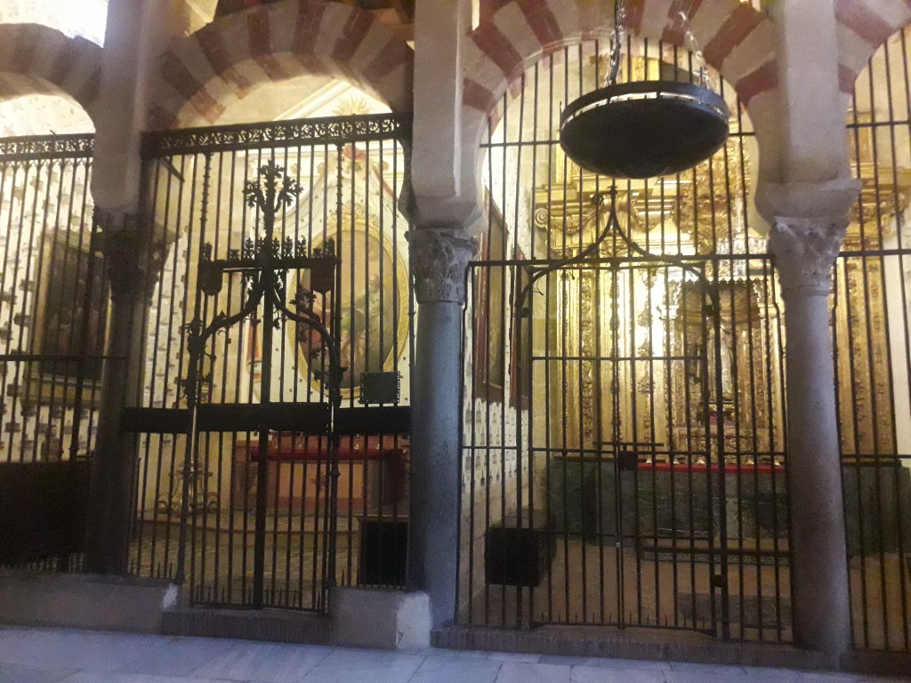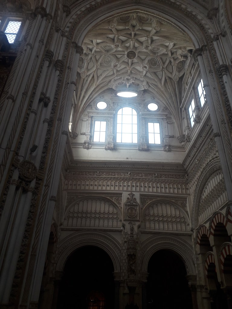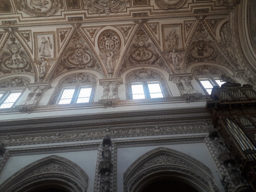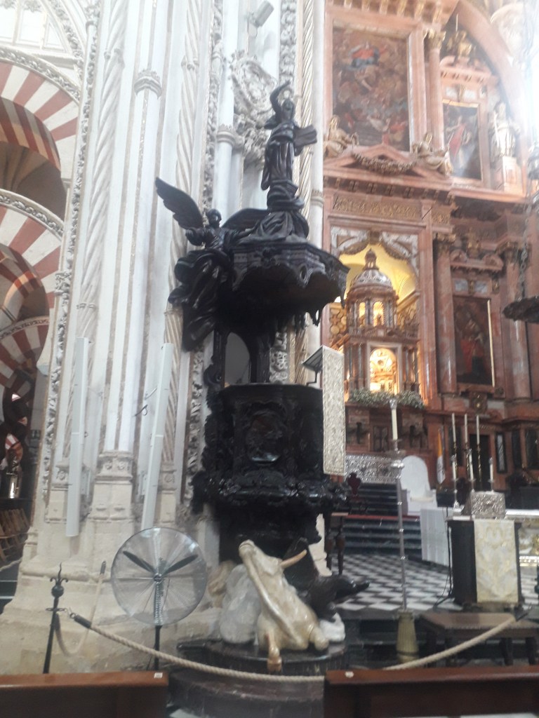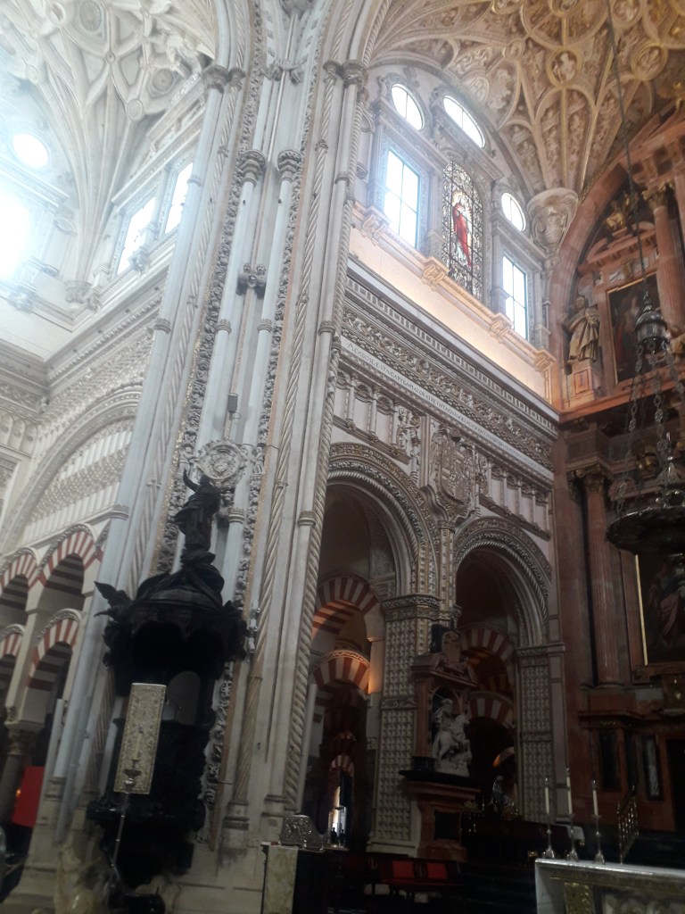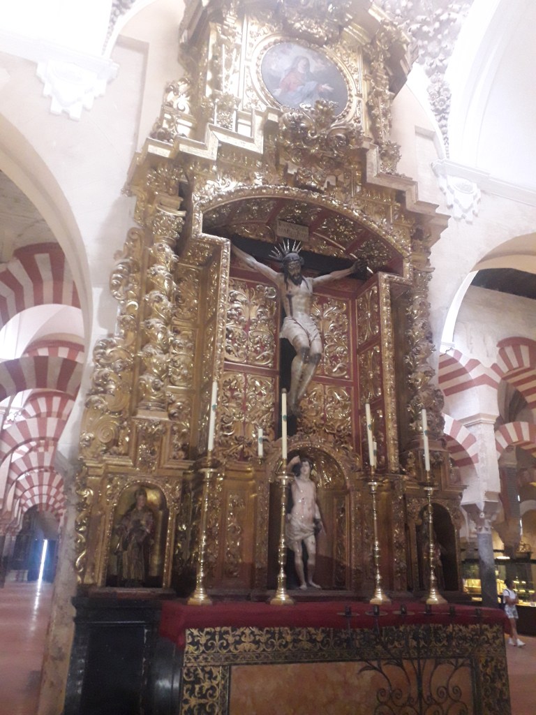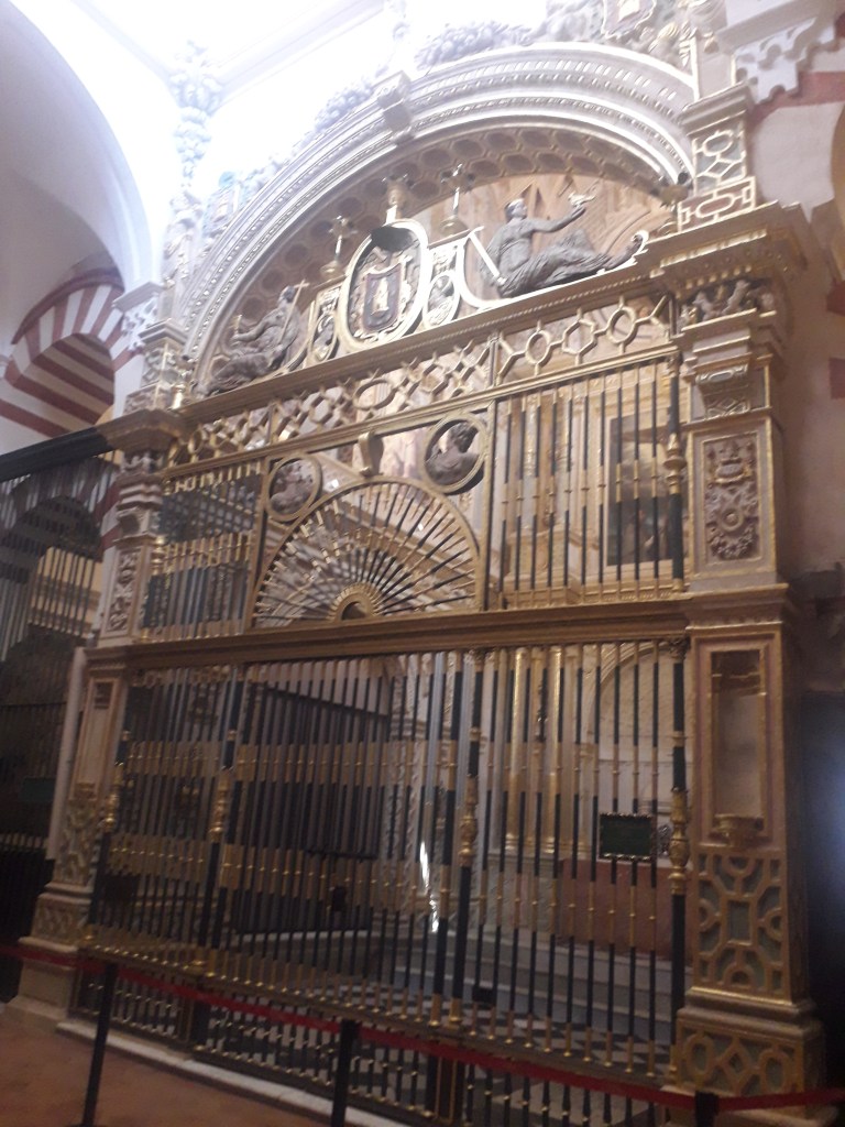 Comme vous l’avez remarqué, la religion chrétienne s’est approprié ce qui fut la troisième mosquée du monde par sa taille. 🕌 En effet, Cordoue était une ville califale. Elle était également l’agglomération la plus importante d’Europe à cette époque, forte d’un demi-million d’habitants. Voici quelques photos du chœur baroque de la cathédrale, où j’ai pu assister à un sacrifice humain en début de journée, comme je le fais chaque dimanche, lorsqu’un prêtre renouvelle la mort du Christ en consacrant le pain et le vin sur l’autel :