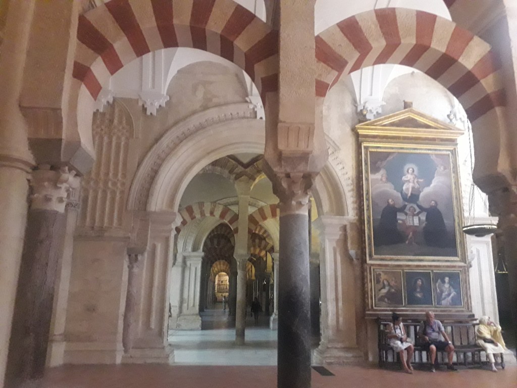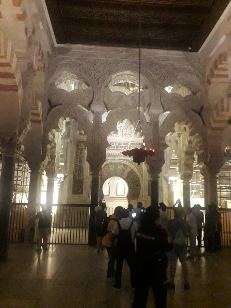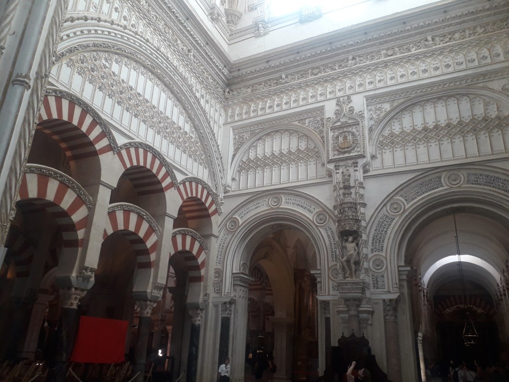 Le jeudi 15 août, an de grâce 2024, nous sommes allés à la mosquée-cathédrale de Cordoue pour assister à une magnifique messe solennelle en l’honneur de la Vierge Marie, dont nous fêtions l’Assomption. 🌸 De fait, l’église baroque construite au milieu de cet ancien lieu de prière musulman est dédiée à la Mère de Dieu, élevée au Ciel avec son âme et son corps, sans que ce dernier n’eût subi la corruption de la mort. 💀 En effet, la mort est une conséquence du péché, or les catholiques croient que Marie n’a jamais fauté, car elle est l’Immaculée conception. Le dogme de l’Assomption a été reconnu officiellement par le Pape il y a moins d’un siècle, après quelque deux millénaires de croyance populaire. La messe, présidée par l’évêque du lieu, était magnifique, chantée par d’excellents choristes, certainement professionnels.