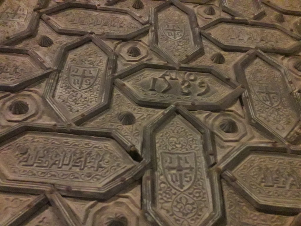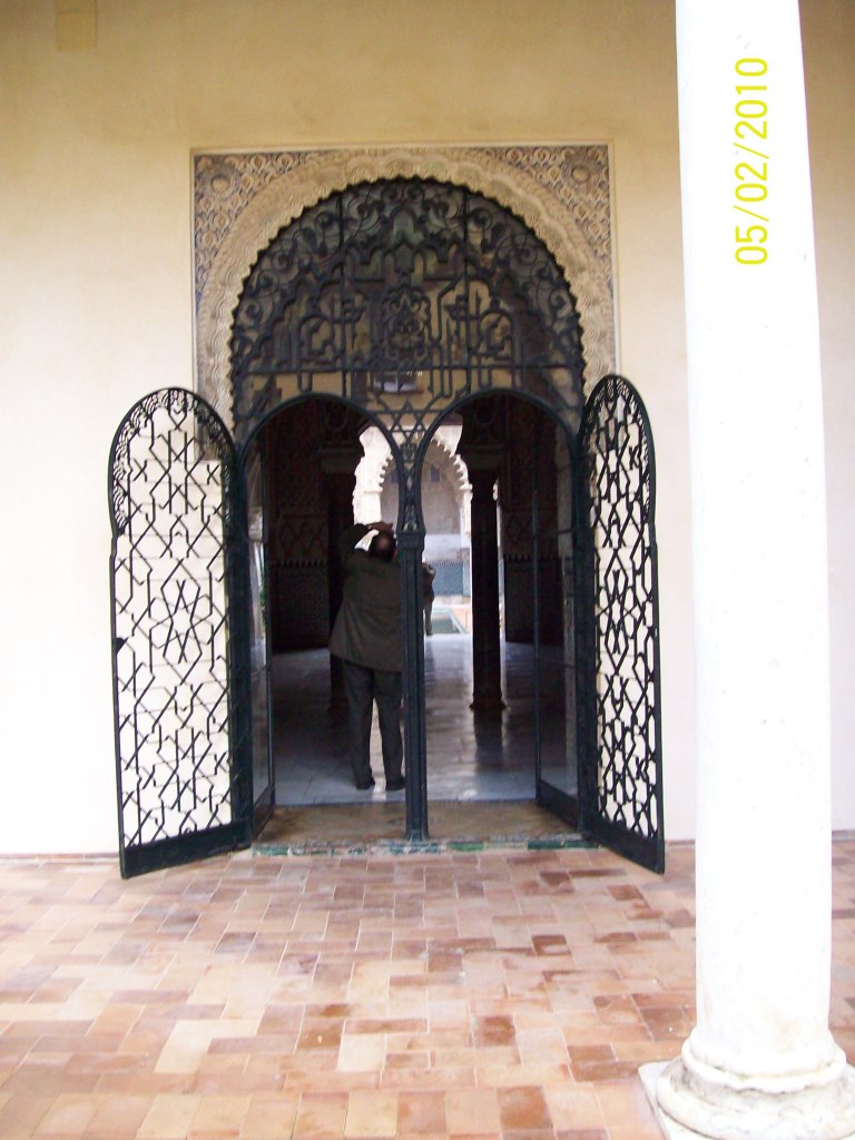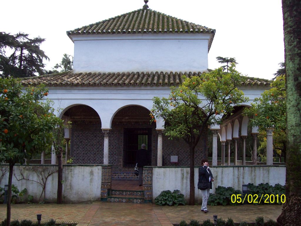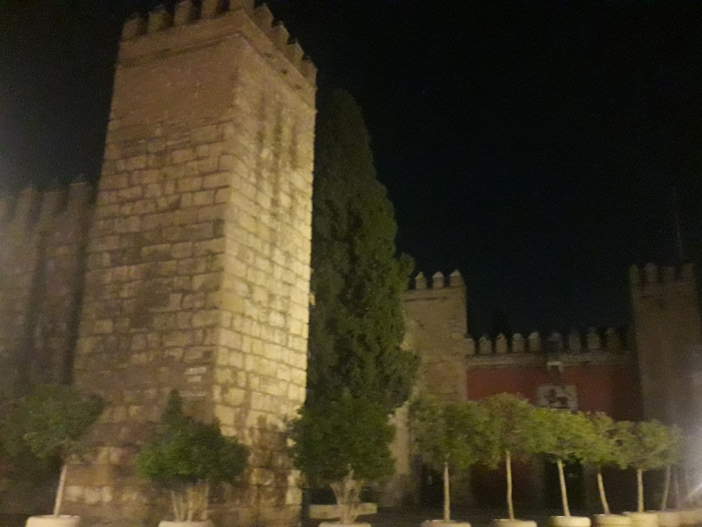 Veuillez trouver ci-après quelques photos de l’alcázar prises à cette époque. Cette bâtisse imitant l’Alhambra de Grenade était une manière, pour les souverains castillans qui venaient de reconquérir l’ouest de l’Andalousie, de rivaliser avec les princes nasrides. Comme à d’autres endroits, les imitations de calligraphie arabe par les artisans mudéjares ne veulent absolument rien dire.