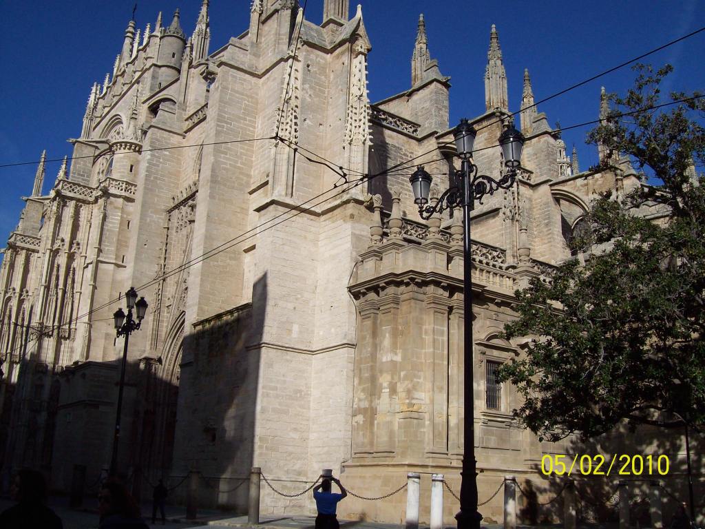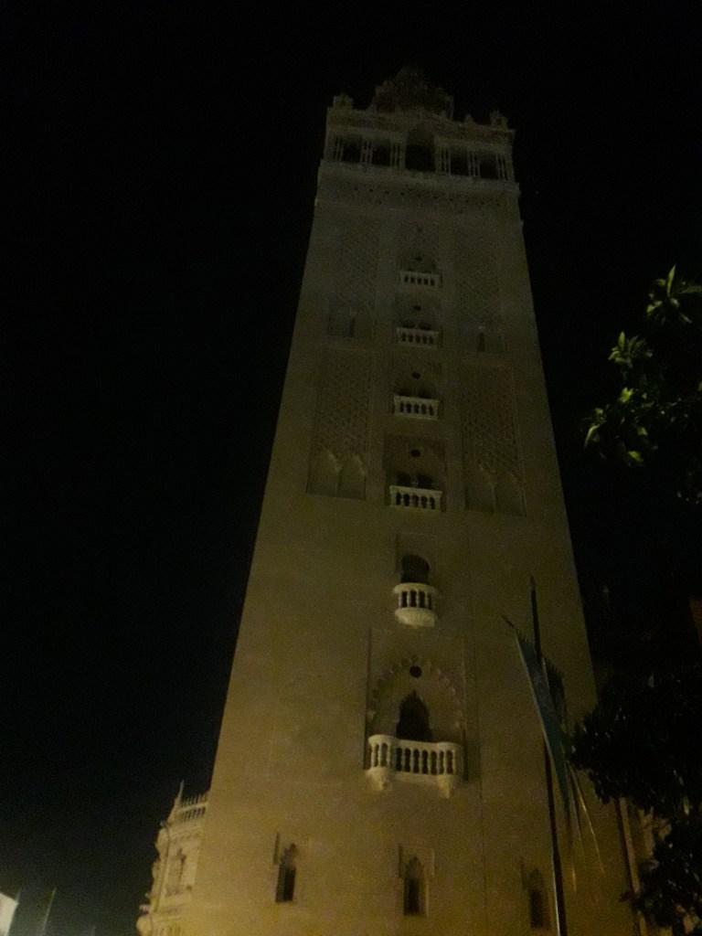Enfin, veuillez trouver ci-après quelques photos de jour (datant de 2010) et de nuit (prises pour la plupart en 2024) de la cathédrale de Séville. ⛪ Il s’agit d’une ancienne mosquée, qui conserve son minaret, transformé en clocher et surmonté d’une célèbre girouette, la Giralda. L’édifice a été réaménagé en architecture gothique, mais certains éléments hispano-musulmans (almoravides en ce qui concerne la fameuse tour) ont été conservés. 🕌 De son ancienne fonction, ce lieu de culte conserve également sa Cour des orangers. 🍊 De surcroît, l’église abrite les cendres de Christophe Colomb. À proximité se trouve une statue équestre du Cid.