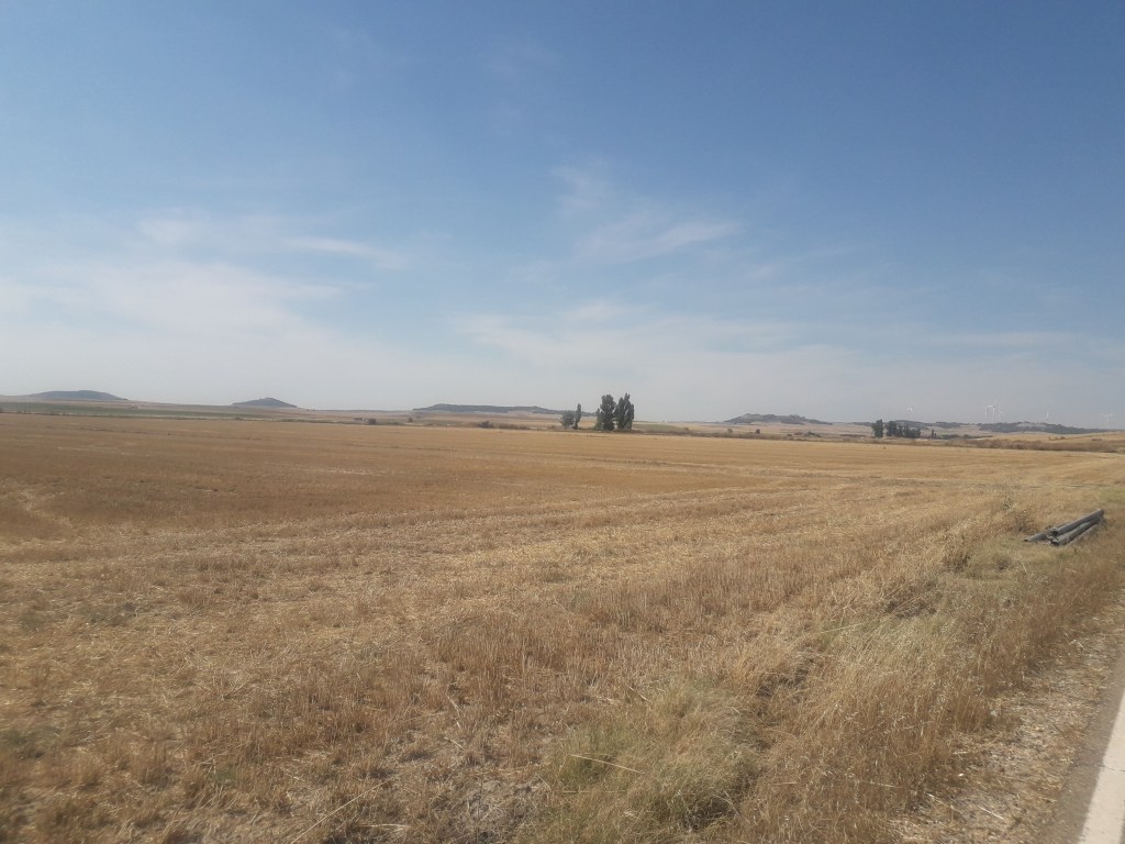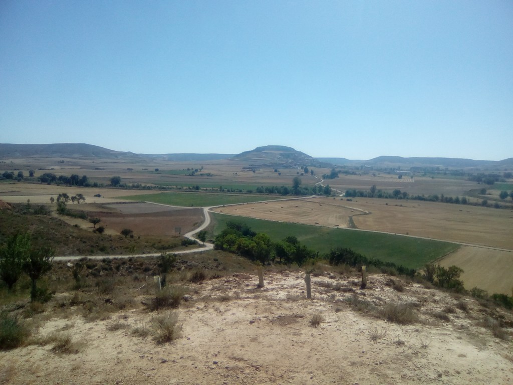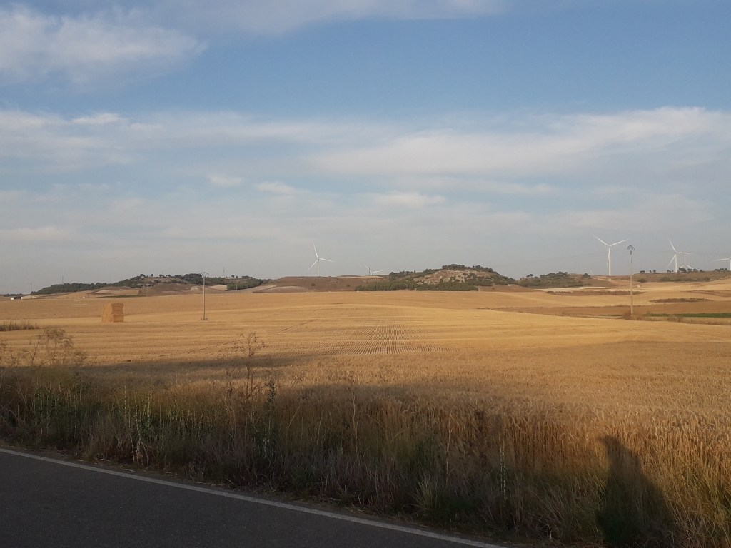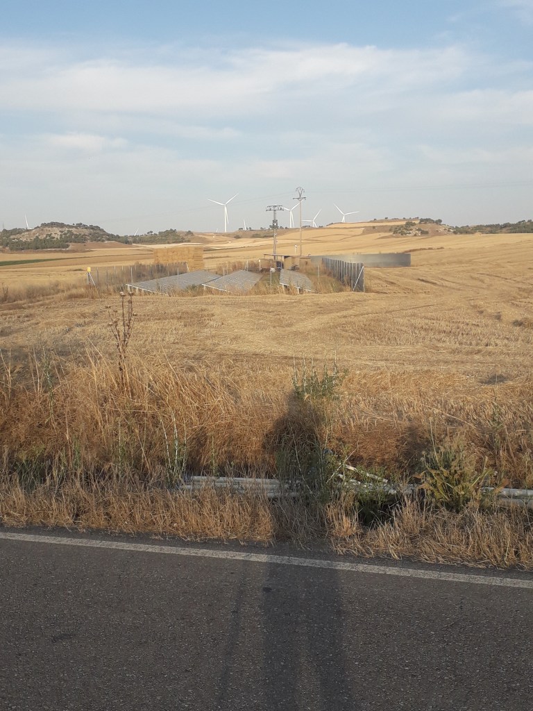 Parti plus tard que prévu de Saragosse (j’avais besoin de roupiller un peu), j’ai décidé de ne pas ouvrir le trajet à d’éventuels covoitureurs, pour différentes raisons. Au milieu des paysages tout aussi vallonnés et désertiques que la campagne vallisolétane, j’ai roulé la plupart du temps à 60 km/h, pour des raisons environnementales et budgétaires. Je me suis fait klaxonner deux fois, ce qui m’était peu arrivé depuis que j’ai franchi la frontière. Il faut dire que je n’ai pas encore pris le temps d’imprimer et d’afficher la version espagnole de mon écriteau « Écoconduite : doublez-moi ! », que j’ai placé sur la lunette arrière. Néanmoins, j’imagine que les automobilistes et camionneurs qui me suivent comprennent l’idée de la version française, d’autant plus que la police est en vert. Si ce message leur était vraiment hermétique, je me ferais certainement beaucoup plus klaxonner. 😅