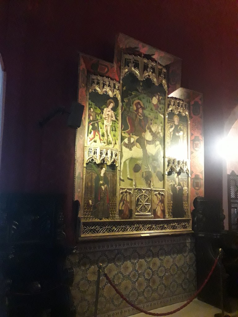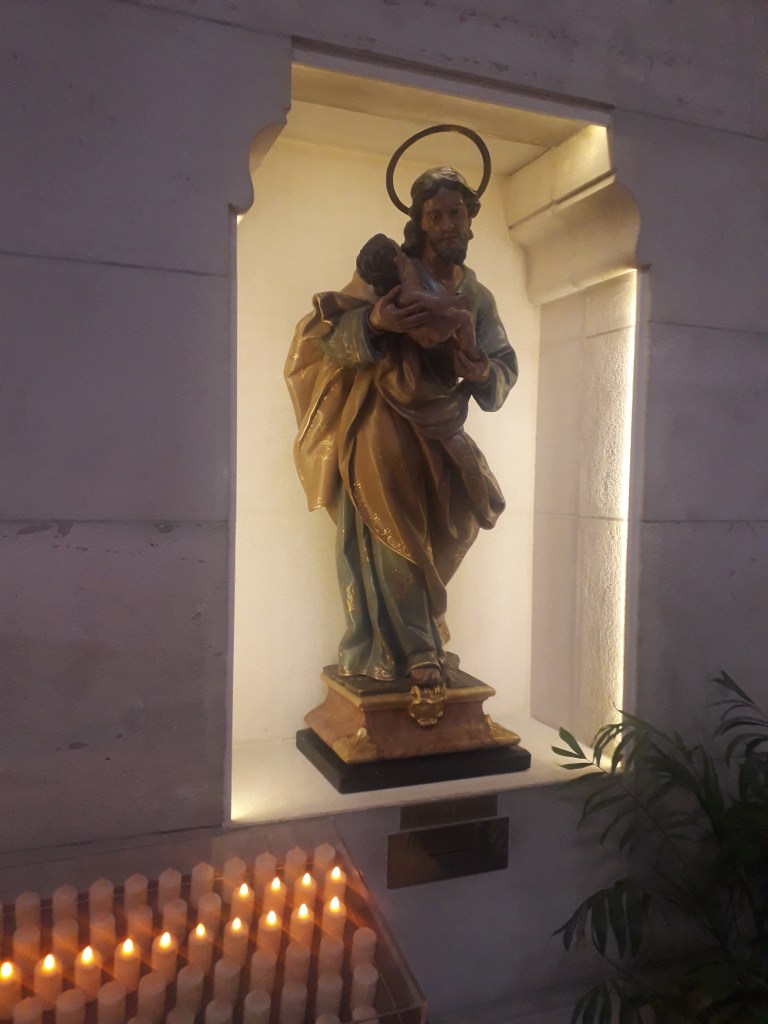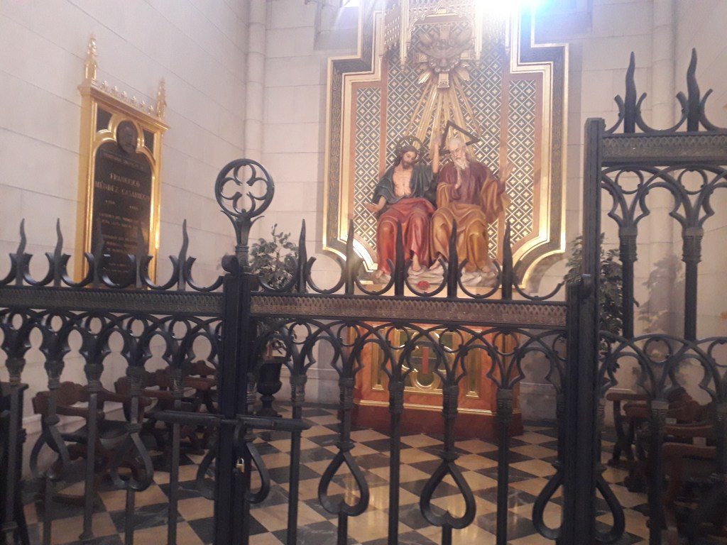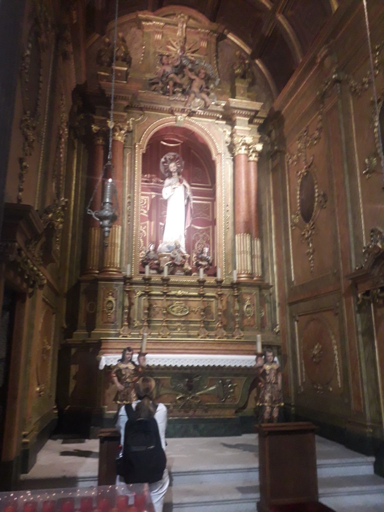 Après avoir quitté les lieux, j’ai à nouveau marché vers la Sagrada Família pour y vivre la messe dominicale anticipée et découvrir l’intérieur de l’édifice par la même occasion. 🙂 Ayant alors très peu de batterie à ce moment-là, je n’ai pu prendre que quelques photos de la crypte, seul espace qui nous était accessible. Contrairement à mes attentes, la décoration m’a paru, au premier coup d’œil, assez classique, assez semblable à ce qu’on trouve dans une église gothique. Mais, en scrutant davantage, j’ai découvert que les style néogothique et moderniste y sont très élégamment mêlés, produisant à résultat à la louange et à la gloire de l’Artiste par excellence. 🎨 À ce titre, le tabernacle, où repose le Corps du Christ, me semble particulièrement réussi. La lumière rouge signifie que des Hosties consacrées se trouvent à l’intérieur et donc que, pour les croyants, Dieu y est réellement présent :
