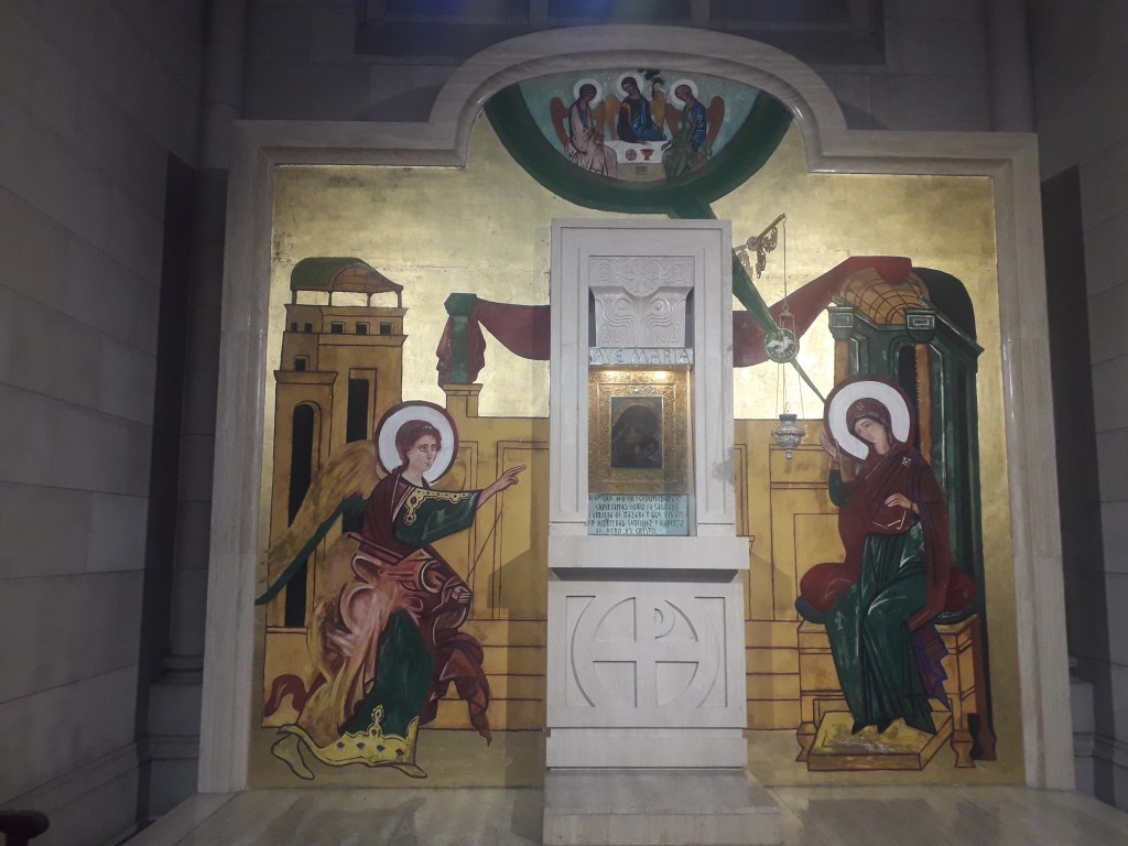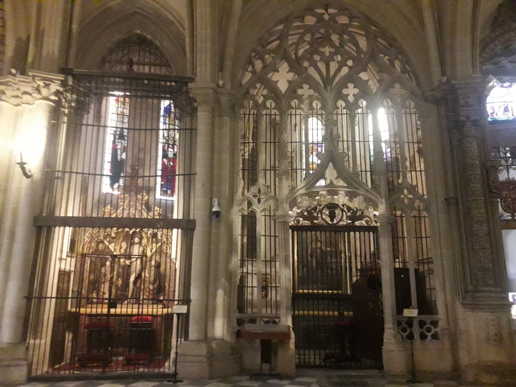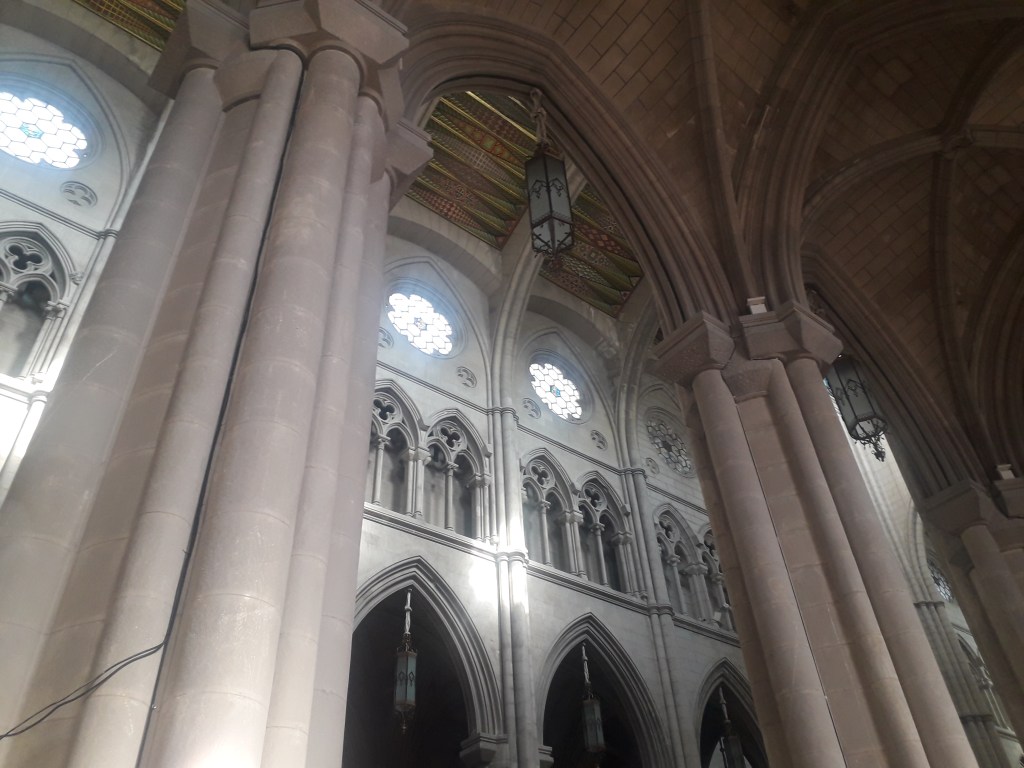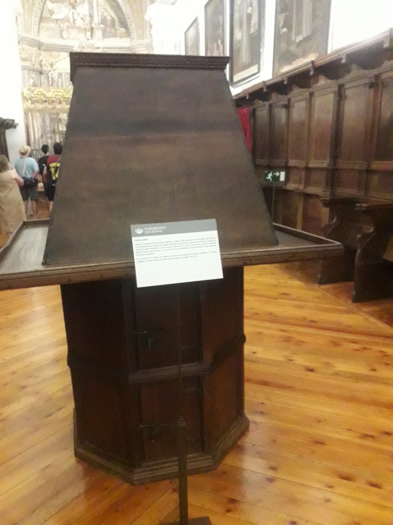 Après avoir quitté les lieux, j’ai à nouveau marché vers la Sagrada Família pour y vivre la messe dominicale anticipée et découvrir l’intérieur de l’édifice par la même occasion. 🙂 Ayant alors très peu de batterie à ce moment-là, je n’ai pu prendre que quelques photos de la crypte, seul espace qui nous était accessible. Contrairement à mes attentes, la décoration m’a paru, au premier coup d’œil, assez classique, assez semblable à ce qu’on trouve dans une église gothique. Mais, en scrutant davantage, j’ai découvert que les style néogothique et moderniste y sont très élégamment mêlés, produisant à résultat à la louange et à la gloire de l’Artiste par excellence. 🎨 À ce titre, le tabernacle, où repose le Corps du Christ, me semble particulièrement réussi. La lumière rouge signifie que des Hosties consacrées se trouvent à l’intérieur et donc que, pour les croyants, Dieu y est réellement présent :