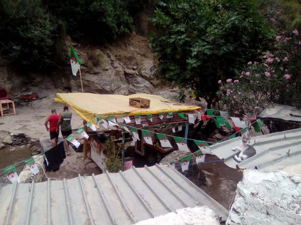 Eh non, ce n’est pas une carte postale, mais une photo que j’ai prise avec mon vieux smartphone âgé de 3 ans. Ne me demandez pas le nom de cette montagne : je n’en sais rien. On se croirait en Savoie pendant l’été… Et voici une belle image des chutes ! En bas, nous piquons une tête dans cette piscine naturelle d’eau douce. Après quelques jours de plage, ça fait bizarre de boire la tasse et de se rendre compte que la flotte n’est pas salée… Petit cliché pour vous montrer qu’en Algérie, certaines femmes sont voilées et d’autres non. Avez-vous déjà pensé à prendre un verre les pieds dans l’eau ? Comme le souligne Gad Elmaleh, les Algériens sont très fiers de leur drapeau et l’affichent partout. Quelques cabanes bucoliques en aval des chutes